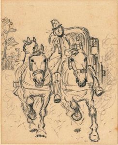 Emmanuel Poiré, dit Caran D’ache (1858-1909) dessinateur et caricaturiste. Dessin original au crayon noir ; 11,3 x 9,4 cm, monté sur carton. Dessin d’un attelage tirant une diligence, menée par un homme chevauchant l’un des chevaux de tête....