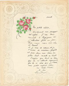 Paul éluard. L.A.S. « Paul », [Lunel] samedi [fin février 1931], à Nusch ; 1 page in-4 sur papier à encadrement gaufré et ajouré façon dentelle avec bouquet de fleurs peint. Jolie lettre à Nusch sur papier décoré. « Ma petite chérie,...