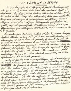 Paul éluard. Manuscrit autographe signé, Le génie de la parure, [1937] ; 1 page et demie in-4. Très beau texte sur les coiffures du Congo publié dans la revue Marianne en 1937, à l’occasion de l’exposition La Mode au Congo à la galerie...