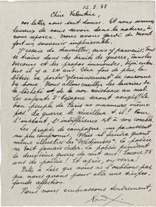 Paul éluard. L.A.S. « Paul », 12 août 1938, à Valentine Hugo ; 1 page petit in-4, enveloppe. Belle lettre à son amie Valentine Hugo, en vacances chez Lise Deharme à Montfort (Landes). « Chère Valentine, vos lettres nous sont douces. Et nous...