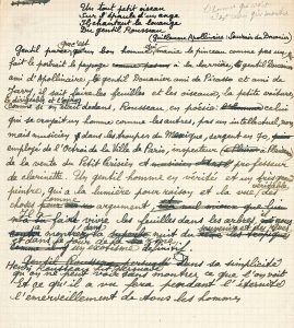 des Arts au Musée d’Art moderne de la Ville de Paris (22 décembre 1944-21 janvier 1945). Le manuscrit, avec de nombreuses ratures et corrections, présente d’importantes variantes avec le texte publié. Il est précédé d’un quatrain d’Apollinaire. « Gentil parce que c’est un bon homme qui manie le pinceau comme pas un, qui fait le portrait le paysage à la barrière, gentil Douanier ami d’Apollinaire, gentil Douanier ami de Picasso et ami de Jarry, il sait faire les feuilles et les oiseaux, la petite voiture, le dirigeable et l’aéro comme si on était dedans. [^] Dans sa simplicité Henri Rousseau fut persuadé qu’on ne peut voir sans montrer ce que l’on voit. Et ce qu’il a vu fera pendant l’éternité l’émerveillement de tous les hommes ».