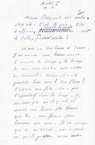 radiophonique diffusée sur France-Culture en 1967, puis publiée en ouverture du n° 1 de La Nouvelle Table Ronde (mai 1970, exemplaire joint, sous l’emboîtage), puis en édition originale, avec deux autres pièces pour la radio, la même année, chez Gallimard (collection « Le Manteau d’Arlequin »). Dans le milieu provincial et ouvrier de Chaminadour (le Guéret de Jouhandeau), une ancienne et très brève passion charnelle révélée par malveillance se termine en tragédie. Marie et Serge Pingaud vivent depuis vingt ans dans une harmonie conjugale sans faille quoiqu’un peu monotone. Marie a une confidente, Jeanne Desmoulin, une veuve dont le mari toujours passionnément aimé d’elle quoique disparu, David, avait péri quinze ans auparavant dans un accident. Cet époux volage était en outre le meilleur ami de l’austère Serge. Mais voilà que ce bonheur sans histoire se trouve ébranlé par une discussion malveillante entre hommes au café. On veut se venger de Serge, obsessionnel contempteur des maris trompés et des trop faibles femmes. On lui révèle que son ami David, coureur invétéré, était parvenu à séduire sa femme quelques jours seulement avant sa mort. Serge, hors de lui, fait avouer le crime à Marie, la bat et l’humilie devant sa mère et les femmes du voisinage. Mais Marie revendique crânement et publiquement ce très bref écart de conduite, instant d’amour qui, dit-elle, aura éclairé et justifié toute sa vie. Serge, se considérant comme déshonoré, prononce sa sentence : que Marie l’étrangle ! Ce qu’elle fait, avant de se livrer à la police. Cette tragédie en trois actes ou épisodes permet à Jouhandeau d’exprimer la vision quasi mystique de l’amour physique à laquelle il tient. Cette conception apparaît par exemple dans cet extrait d’un monologue de Marie, texte déjà travaillé dans notre manuscrit, mais qui sera totalement refondu dans la version de la revue : « En somme, si je n’avais pas connu David, je n’aurais pas connu ce je ne sais quoi qui donne un sens à la vie. Qu’est-ce que c’est ? La passion, la possession d’un souvenir ineffaçable. David ! Il n’a fait que passer dans mes bras, mais grâce à lui, je ne suis plus seule quand je suis seule ; je suis moins seule, même entre les bras de Serge. Comment regretter cette sorte d’effacement de tout au bénéfice d’un être radieux, illuminé dont une fois pour toutes le corps a couvert le vôtre et satisfait en un instant l’âme toute entière comme si, le ciel entrouvert, on avait connu ensemble le paradis... » (Acte III, scène 1). Le manuscrit présente de nombreuses ratures et corrections. Il est conservé sous une chemise titrée par Jouhandeau, avec liste des personnages et le synopsis original. Les 78 pages du manuscrit se répartissent en trois séries de feuillets (42 en tout, sans compter la chemise de titre) paginés par Jouhandeau au crayon rouge de façon discontinue, selon les états différents du texte : certains sont très corrigés et leurs variantes lisibles révèlent une version primitive déjà travaillée mais qui sera développée encore, les autres mis au net avec quelques repentirs ou ajouts. Malgré cette relative hétérogénéité, la pièce peut se lire aisément dans sa continuité manuscrite, mis à part deux courts passages intercalés en typographie à leur place. 24 autres pages (13 feuillets) sont rassemblées dans un dossier de brouillons. Écrites de différentes encres, d’une graphie tantôt appliquée, tantôt très hâtive, elles présentent des versions différentes de certaines scènes, avec de significatifs ajouts ou repentirs. Le manuscrit présente d’importantes variantes avec le texte définitif, notamment des termes trop crus qui ont été atténués. Le mari jaloux change de nom au cours de la rédaction. Des phrases entières disparaîtront dans des remaniements ultérieurs, comme cette longue didascalie : « Alors, Marie se redressant de toute sa taille et levant la tête, son regard fixé hardiment dans les yeux de Serge se mit à parler d’une voix claire, presque triomphale, comme accompagnée de grandes orgues. » Même sort pour le surtitre générique inscrit par Jouhandeau sur la page de titre : Comédies et Proverbes, et pour sa note pourtant significative au bas de la même page : « “Tout ou rien” était la devise de St Thérèse d'Avila ». Cet ensemble apporte de précieux éléments sur la genèse de la pièce. D’après le synopsis initial, on constate que deux scènes capitales [troisième monologue de Marie et aveu public], non prévues au départ, sont ajoutées sur le manuscrit, qui intègre en revanche une scène qui sera supprimée dans la publication (Acte I, scène 4 : duo d’amour entre Marie et Serge, 2 pages).