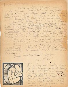 Poussin pour F^^ ^ (2e année, n° 4, mai 1922). 6 mars 1922. Lhote écrira avec plaisir sur les dessins du Poussin, « admirables créations de l’esprit qui me paraissent hélas exercer bien peu d’influence et sur la mentalité du public, des critiques, et sur celle des artistes. Parmi ces derniers, les uns, les “sensibles” comme on dit, ne voient que les bavures du dessin et ne se rendent pas compte que la sensibilité classique est plutôt dans l’ordonnance des objets que dans la défaillance de la main ; les autres ne voient, dans cette ordonnance, que ce qui a trait à la règle et au compas, et oublient tout le côté humain de l’affaire »... Il envisage l’influence de Poussin sur notre époque comme celle de David, « purement négative »... [Pont du Gard fin mars ? 1922]. Il envoie son texte et le dessin de la lettrine demandée [dessin à la plume au bas de la lettre, 6,8 x 6 cm], en exprimant sa pleine confiance pour la transposition bois. « Nous avons du temps devant nous pour penser à une étude sur le 1er cubisme ou cubisme impressionniste, ou cubisme français ou d’avant-guerre : Cézanne, Braque, De La Fresnaye, Delaunay, Gleizes, Metzinger, Léger, Lhote. Cubisme de sensation, à opposer à cubisme de conception : Picasso, Braque actuel, Gleizes actuel, Juan Gris, Marcoussis, Survage etc., c. à d. cubisme influencé par l’exotisme. Pas pressé. Il y a aussi Breughel, aussi important, pour d’autres raisons, que Signorelli »... L’article Les dessins de Nicolas Poussin s’ouvre par un hommage au recueil de reproductions publié récemment par Helleu, passé à peu près inaperçu du grand public, éloigné d’un art aussi élevé et mesuré. Puis il se livre à une analyse de la manière dont Poussin voyait la nature, « attitude transcendante » qui indispose de nos jours ceux qui jugent sa peinture froide... Lhote s’étonne que les dessins ne plaisent pas davantage. Il relève l’« exaltation spirituelle », la spontanéité et le pittoresque de ses esquisses à l’encre : rien de plus moderne. « L’air et la lumière circulent dans ces paysages en deux tons avec autant de vérité que dans ceux de Cézanne ou de Renoir. Les arbres se gonflent de souffles ; les herbes et les feuillages frémissent ; les nuages et les eaux coopèrent à ce vaste mouvement cosmique »...