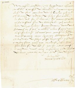 chancelier Victor Brodeau ; 1 page in-4, adresse (petite répar. à un coin inf. sans toucher le texte). Le Roi et Madame envoient le S. de Fors au Parlement pour dire « le vouloir quilz ont que le procez de madame de Soubize soit maintenant le premier mis sur le bureau, et pource que elle et ses enffans sont de telle sorte quilz meritent bien une particuliere recommandation envers vous ».