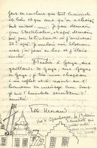 défilent Proust, Cocteau, Satie, Radiguet, Coco Chanel, Misia, etc. Deux lettres sont ornées d’un dessin à la plume. 23décembre 1920, « au lendemain matin de la 1ère de Parade. Nous avons pré-réveillonné avenue d'Eylau. J'ai perdu ma cravate et mon chapeau. Jean [Cocteau] a cassé le piano avec Auric. Stravinsky a bu la vodka comme la Volga etc. C’était très beau et nous vous avons bien regretté. On recommence demain chez Chanel »... Il a trouvé un petit pavillon rue Daubigny. 2 janvier 1921 . Il envoie ses doubles vœux « mais non en des vers d’un-professeur-d’anglais-ayant-des-loisirs [Mallarmé] et qui nous gâtent à jamais le faune avec ses marrons glacés à la main ». Puis Morand parle de la brouille entre Cocteau et Gallimard, à cause du livre L’Éventail de Marie Laurencin, puis de la reprise de Parade : « tout uniment un succès ; c’était plus au point qu’en 1917 ; la petite fille était une merveille de triste enfance foraine et le cheval avait au dos une petite selle de toile bleue délavée qui ajoutait au plaisir. Tout ceci, beaucoup grâce à Jean qui se divisa et m uliplia ». Suit une soirée folle avec les Russes : « Auric se fendit les doigts sur le piano et le sang coulait sur le clavier. Jean, désarticulé, initiait la duchesse de Gramont à un cancan brisé [...] Drieu et Larionoff s’étayaient penchés comme des murs de mansarde. Chanel, les jambes en l’air, ronflait sur un canapé. Stravinsky buvait son ammoniaque. J.M.S[ert] prenait dans les pardessus renversés une leçon de natation. Miassine faisait au centre du parquet, très vite, des choses tout seul, et puis tombait d’une masse [.] Ansermet à qui Misia voulait couper la barbe s’était entouré la tête d’une serviette »... Au réveillon chez Chanel, Cocteau a fait du jazz « sur la grosse caisse bleue et blanche de Stravinsky. [.] On s’amusa moins, malgré un incomparable souper ». Cocteau passa au jour de l’an « une nuit de débauche au Pélican », qui vient d’ouvrir. « Vous lirez la préface de Proust dans mon livre [Tendres Stocks] qui va paraître [...] Je fais un autre volume de nouvelles [Ouvert la nuit] pour l’été », mais n’a que son dimanche après-midi pour travailler... Il va s’installer rue Daubigny, dans « cequartier idiot - 1875 - peluche et fer forgé - de la Plaine Monceau »... 20 avril 1921. De Kristiania, Morand envoie d’amusantes impressions de No^ège : ébats érotiques d’un couple dans la chambre voisine, gens affreux (« profils lapons ; c’est qq.chose comme le type mongoloïde avec le teint anglais. Seul le cheveu pâle genre soleil de minuit »), restaurants avec « des harengs en or ». Évocation du Palais de Danse à Berlin... Réflexions nostalgiques sur « les Samedistes » qui devraient « se rallier à la bienveillance, non pas forcée, mais librement concentie [.] tout le monde est mal. Alors il faut en conclure que tout le monde est bien et que ceux qu’on a choisis sont mieux ». À la fin de la lettre, amusant dessin à la plume d’une « vue de Copenhague ». 30 octobre 1921. Visite au Salon d’Automne, où il croise Mme André Breton coiffée d’un « bonnet conique », Jean-Gustave Tronche qui a quitté la NRF, Auric... « On a repris le chemin du bar samedi : les Bertin, Caryathis amoureuse, Irène [Lagut], Auric, Radiguet qui vient de finir, dit Jean, un roman sublime, genre Adolphe [Le Bal du comte d’Orgel], Dominique etc. [...] Poulenc a travaillé ses Promenades, pour Rubinstein. Milhaud soigne sa mère. [.] Dinette chez Marie Laurencin. [.] Après de laborieuses négociations, j’ai remis mon manuscrit [Ouvert la nuit] à Gallimard et je paraîtrai vers février. Vu Proust cette nuit qui finit Sodome II. [.] Je commence une série de portraits d’hommes », et il dessine à la plume son voisin Émile Henriot en manteau et chapeau...