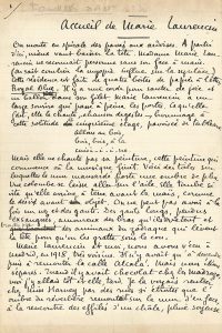 qu’elle fait, elle le chante [.] Mais elle ne chante pas sa peinture, cette peinture qui commence où la musique finit ». Morand évoque l’atelier de l’artiste, des aperçus de ses toiles, leur voisinage amical à Madrid en 1918, et proposant comme « la plus troublante préfiguration » de son art La Chambre double de Baudelaire... « Marie Laurencin se contemple dans un miroir d’étain et à l’infini, plus audacieuse, nous donne son image sans oublier celle de son ange gardien coiffé chez Nicole Groult et tout un bestiaire aux passions mal apprivoisées. Marie, il ne faut pas pleurer [...]. Il faut peindre »... 19 décembre 1921 , lettre d’envoi de ce texte à Lucien Vogel, lui proposant « cette petite prose sur Marie Laurencin. J’ai un joli dessin colorié d’elle qu’elle m’a donné à cette intention, qui ferait très bien soit en vis-à-vis, soit en médaillon central »... [Le texte paraîtra dans le n° 5 de la 2e année des Feuillets d'art, juillet1 922.] 12 avril 1922. Envoi d’un autre manuscrit [La Semaine de Bath] : « C’est extrait d’un faux journal de guerre (Londres 1916) qui finit sur l’exécution de Sir Roger Casement. Quand cela passera-t-il ? »...