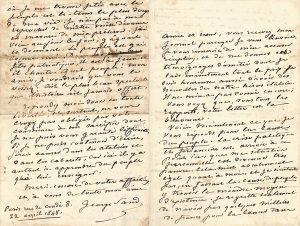 George Sand (1804-1876). L.A.S. « George Sand », Paris 22 avril 1848, [à son amie Eliza Ashurst] ; 4 pages in-8 à son petit chiffre gothique (un peu salie à la dernière page). Très belle lettre inédite sur la révolution de 1848 et son...