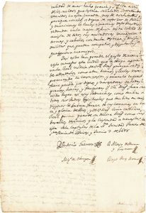 d’Espagne Charles II ; 2 pages in-fol. ; en espagnol (bords effrangés). Intéressant document pour la défense de Buenos Aires contre les attaques des Français. Le Cabildo de Buenos Aires dit sa confiance dans le gouverneur Don Agustin de Robles pour les mesures à prendre, après le sort malheureux de la cité de Cartagena, pour se défendre de l’ambition sans frein des Français. Ils évoquent notamment les dispositions pour armer deux mille Indiens des réductions sous la responsabilité des Religieux de la Compagnie de Jésus entre les rivières Parana et Uruguay. On joint un feuillet avec résumé de cédule (1687) et un cachet fiscal découpé.