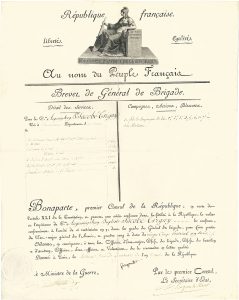 nominations, laissez-passer, décorations (médaillon des Deux Épées, Légion d’Honneur, Fleur de lys), lettres de services et ordres de déplacements, affectation au collège électoral de la Marne, lettres amicales lors de sa suspension en tant que commandant du pays de Berg. On relève notamment son brevet d’adjudant-général en 1793 (signé par Clavière et Beurnonville, un autre avec les griffes de Dalbarade et Bouchotte), celui de général de brigade signé par Pille (1795), et un autre de 1801 signé par Bonaparte (secrétaire), H. Maret et Berthier ; des documents signés par les maréchaux et généraux Augereau (3), Alexandre Berthier, Dépaux, Clarke comte d’Hunebourg (2), Kellermann duc de Valmy, Soult duc de Dalmatie, Watrin, ou par les ministres et administrateurs Cambacérès et Champagny, Fontanes (avec la décoration de la Fleur de Lys jointe), Garat, le Grand Chancelier Lacepède (4), L. A. Pille, etc. Plus des correspondances privées ; quelques documents civils : actes de naissance de ses enfants, reçus, pensions et rentes, inventaire après décès, etc. ; quelques imprimés, etc.