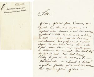 avoir conspiré contre la monarchie, les jeunes sergents Jean-François Bories, Jean-Joseph Pommier, Marius-Claude Raoulx et Charles Goubin, seront guillotinés en place de Grève, le 21 septembre 1822, et aussitôt considérés comme des martyrs du républicanisme.] La supplique adressée au Roi rappelle que la date fixée pour l’exécution est celle de l’anniversaire de la petite-nièce de Louis XVIII, fille du duc de Berry : « Grace, grace pour l’innocent, amis parents nous sommes à vos genoux, nous implorons votre clemence, à vous seul maintenant appartient le droit de rendre la vie ou de donner la mort, dans quelques heures les benedictions vous entourreront, dans quelques heures le desespoir abregera les jours d’une mère. Dieu a dit il faut mieux sauver dix coupables que de condamner un innocent. Un mot Sire et tous les cœurs vous sont dévoués. Celebrez le jour de la naissance de Mademoiselle en rendant le bonheur a quatre familles qui en vous seul, mettent leur espoir. Grace grace ». Louis XVIII rejette la demande : « Le placet est touchant, je n’en puis disconvenir, mais le devoir marche avant la pitié ». [Selon Philip Mansel, qui cite ces derniers mots, Louis XVIII en fit un principe inexorable tant que les conspirations semblaient menacer le trône (Louis XVIII, Pygmalion/Gérard Watelet, 1982, p. 412).] Archives du comte de Villèle.