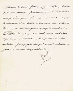 Napoléon Ier. L.S. « Napole », Amsterdam 19 octobre 1811, au Duc de Feltre, ministre de la Guerre ; la lettre est écrite par Menneval ; 3/4 page in-4. Sur la défense des places de Hollande. « Il y a à Lille un bataillon de chasseurs rentrés....