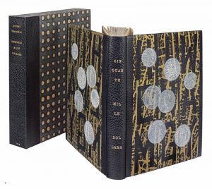 HEMINGWAY (Ernest). Cinquante mille dollars. Paris, Gallimard, 1928. In-4, buffle bleu nuit orné d'une composition noire et or de veau mosaïqué et empreintes blanches de pièces de monnaies, dos lisse, non rogné, doublure et gardes de papier...