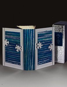 deux pièces de puzzle métalliques, dos lisse du même daim bleu argenté, doublure de papier simili-aluminium, gardes de daim bleu marine, non rogné, couverture et dos, chemise et étui assortis (F. Rousseau, 2014).