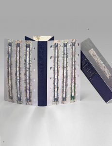 rivetées, dos lisse de daim bleu estampé, doublure de même peau, gardes de daim bleu marine, non rogné, couverture et dos, chemise et étui assortis (F. Rousseau, 2014).