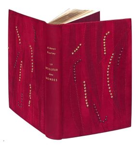 relief, dos lisse, gardes de daim violet, non rogné, couverture et dos, emboîtage de maroquin bordeaux (F. Rousseau, 2014).