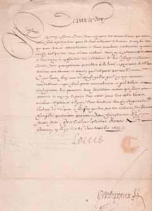 Lettre du jeune Roi contresignée par Phélypeaux, concernant la levée des impôts ; il ordonne d’envoyer dans chacune des élections les commissions pour le paiement des tailles, et de bien veiller au soulagement des pauvres ; (…) ce que vous ferez avec tel soing et égallité (…) et que chacun porte commodément ce qu’il debvra au soulagement des pauvres leur facillitant autant que faire ce pourra le moyen de païer leur cottité, pour leur oster touttes occasions de plainctes (…).