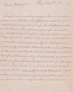 Le duc de Nivernais refuse de communiquer la correspondance de Voltaire ; (…) J’ai effectivement entre les mains une partie de la correspondance de feu M. de Voltaire avec son ami M. Thieriot. Elle m’a été remise par un frère de ce dernier qui m’est attaché depuis longtems et qui s’en rapporte à moy sur l’usage à faire de ces lettres. Je les ay luës avec attention et je crois qu’elles ne doivent pas voir le jour (…). Le duc de Nivernais considère que les lettres ont peu d’importance littéraire, et la majorité sont en anglais. Pour certaines, on doit se garder de les publier et on ne peut faire un meilleur usage des détails qu’ils contiennent que de les jetter au feu (…). Je ne puis contribuer en rien à l’augmentation de l’Edition intéressante que vous préparez (…).