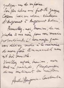 Belle lettre politique de Benjamin-Constant qui remercie le directeur du Figaro pour son article ; (…) Cette citation ne peut que me faire du bien, par de- là les mers. Pour moi, je n’y vois qu’une preuve d’amitié de plus, en me venant de vous, et la nécessité d’aimer mon art par-dessus tout ! (…). Anatole France est adorable et (…) courageusement spirituel… ! avec des plumes comme celles- là… et la rapidité de l’information, un journal peut se passer des nationalistes de ceux qui, sans les armes, font arracher de leur fenêtre la "toque" tricolore ! (…). Il fait part de l’invitation du prince et la princesse de Galle ; Leur simplicité royale fait haïr les gentilshommes stupides et prétentieux. Félix Faure me donnait deux doigts de sa main dans les grands jours (…). Tout cela, malgré moi, me revient au lendemain du duc d’Aumale… et du Prince de Galles… et de Léon XIII… Je hais la pose et la vanité devant tout ce qui nous est si difficile d’acquérir dans le rêve d’art que nous poursuivons, dans le Triomphe de la Justice que nous rêvons (…). Joint une lettre d’André BENJAMIN-CONSTANT, fils du peintre Jean-Joseph, sur la mort de son frère aîné, Emmanuel. Sa mère étant souffrante, il répond à sa place aux questions ; (…) Emmanuel Benjamin Constant (…) mort à Cannes le 17 mars 1900, emporté par une congestion pulmonaire, collabora à la Revue Blanche, où parurent quelques uns de ses poëmes. Son plus intime ami fut M. Jacques Copeau (…).