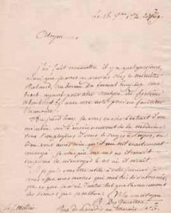 Desgenettes a fait remettre il y a quelques jours chez ministre Roland au bureau du Journal encyclopédique, une brochure ayant pour titre Analyse du système absorbant. (…). Aujourd’huy, je vous envoie l’extrait d’un mémoire sur l’enseignement de la médecine (…). Il demande de lui envoyer la brochure si le texte est imprimé et propose d’envoyer d’autres articles au journal ; Je vous offre mes services qui sont très désintéressés parceque je n’ai d’autre but que l’avancement de la science que je cultive (…).