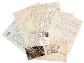 croquis-plans de ses périples au Maroc, 2 télégrammes, carton d’invitation avec apostille aut.; joint l’extrait d’un Journal intime, "Représenter le visage du Christ", 6 pp. imprimées in-8 avec envoi aut. Abondante correspondance artistique du peintre, faisant part de ses voyages en Europe et à travers le Maroc, de ses impressions, et de ses rencontres avec divers amis dont Vidrac ; correspondance accompagnée par la suite de longues réflexions écrites à bâtons rompus sur ses travaux en cours, notamment l’illustration d’une Bible, sur ses découvertes au contact du Maroc, illustrant sa manière de voir la peinture, la lumière, etc., ainsi que diverses affaires en cours concernant ses échanges et un contrat passé avec un éditeur américain. Entre 1948 et 1950, le peintre fait part de ces voyages à travers l’Espagne (visite du Prado), et l’Italie en passant par les Alpes (Florence, Venise, Rome où il est reçu en audience par le Pape, Naples…), puis Assise en 1950. Sept. 1948 : à Florence : Enfin, cette confrontation a eu lieu ; cet art italien, immobile, éternel, tout pétri de génie, nourricier de tout le reste, et… puis moi, là-devant, avec mes errances, mes changements, mes divagations, mes voyages (…). Très beau voyage jusqu’ici ; et j’ai pu franchir les Appenins entre 2 orages (…) Je viens tout a coup de rencontrer Charles Vidrac et sa femme (la sœur de Duhamel). (…). Décembre 1948 : à Rabat : Je vis une vie extrêmement exténuante (…) et moi aussi, je sens, à certains moments, une carcasse qui craque. J’ai du pondre ce mois-ci ; 50 pages écrites pour mes commentaires bibliques, 14 grands dessins et 4 plus petits, pour la Bible, 60 pour mon traité U.S.A. (…) Je suis donc malgré tous mes efforts, en retard de 28 planches. C’est que les forces ont des limites (…). Il n’y a rien à d’intéressant à dire, d’ici, sauf ce qui touche à mon travail. Plus qu’à Paris encore, je suis "en dehors". qq. amis écrivains, qq. peintres, plus ou moins amers et jaloux auxquels j’essaie de rendre service. Et de rares visites de Casablanca (…). 1952 : à propos de créances auprès de Nolibé qu’il veut récupérer, et sur les affaires de son frère ; (…) Il va falloir qu’il paie tout. Et pour l’instant, un banque me fait savoir que ces sommes (350 000 fr et non 400 000 fr ; là encore, je vous fais remarquer les chinoiseries de la maison !) sont bien arrivées. Il lui demande d’intervenir pour ses affaires auprès de Riwrin, Draeger, Marie Sterner, Weill, etc. Il faut que mon dossier Amérique soit fait (…). Oui, jamais je ne me suis occupé de défendre mes intérêts, une réputation, en 1 mot : ma vie ! c’est inouï mais c’est ainsi (…). Il lui demande de lui retrouver des documents de sa bibliothèque dans son appartement de Wagram, relatifs à divers travaux publicitaires qu’il a réalisé pour Guerlain, Peugeot, etc. Edy-Legrand fait souvent part de ses raids dans le désert marocain ; (…) A Assa, le vent du sud m’a fait vivre durement, mais sans empêcher toutefois, que je ne travaille comme je l’avais projeté. C’est dans un petit espace de 10 à 12 m2 que j’ai piétiné, matin et soir, pieds nus dans le sable, devant ma tente, les chameaux et les méharistes (…). Il est impossible, certes de voir tout le Maroc, lors d’un premier voyage, et ceux qui veulent tout voir, ne voient rien (…). Le peintre envisage de faire une exposition qui lui tient à cœur, "vingt ans de Maroc" ; Je me trouve devant un phénomène physique d’impression vivante, dans ma rétine, qui n’a aucun rapport avec les bienfaits de l’âme et du cœur ; il faut que ce Sud ne s’efface pas et que je construise mon exposition (…). Car me voilà sans commande véritable, désormais, et décidé à porter un grand coup ici. En premier lie avec toute cette œuvre, éparpillée (plus de 100 tableaux importants) au Maroc même (…). Je voudrais montrer mon état actuel d’aboutissement (…). Etc.