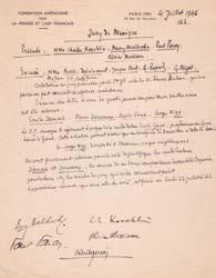 Délibération du jury de musique de la Fondation américaine pour l’examen des titres de quatre compositeurs, Emile Damais, Pierre Dervaux, Emile Goué et Serge Nigg ; le jury n’a retenu que les deux premiers pour le vote définitif des candidatures, considérant notamment la candidature de Nigg, disciple de Messiaen comme trop jeune pour concourir ; leurs œuvres seront lues à la prochaine réunion. Composition des membres du jury de musique avec présents Olivier Messiaen, Charles Koechlin, Henry Malherbe, Paul Paray, qui signent tous, excusés Auric, Delvincourt, Jacques Ibert, Ropartz, Migot et Mme Lefébure, précisant que la candidature au jury de Francis Poulenc a bien été retenue, dans l’attente de sa réponse.