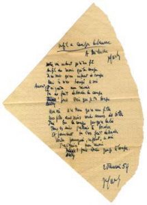 Poème autographe signé, dédicacé « à Michelle » [Vian], intitulé « Le fil à couper le beurre ». 2 janvier 1954 ; sur coin de nappe découpée. « Notre vie ne tient qu’à un fil Au fil du rasoir qui la coupe Je ne suis qu’un enfant de troupe Mais tu m’as trompé ce soir Aussi, j’aiguise mon rasoir Tu as fait déborder la coupe Nelly prie Dieu que je te loupe Ma vie n’a tenu qu’à une fille Une fille aux seins ronds comme des billes J’ai bu la coupe jusqu’à la lie Tous les soirs j’allais te border Et pourtant tu l’as fait déborder Voilà pourquoi ce jour, ce soir J’aiguise mon rasoir Nelly prie Dieu que je te loupe. 2 janvier 54 J.P. Sartre »