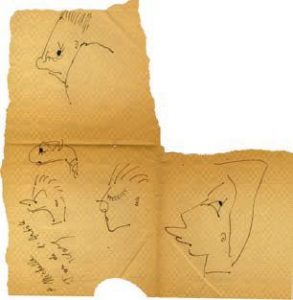 Coin de nappe illustré de dessins, dédicacé à Michelle Vian. Sans date [circa 1954] ; sur coin de nappe découpé. Dessin représentant 5 profils de têtes, dédicacé en bas à gauche : « À Michelle, don de l’Artiste. Sartre ».