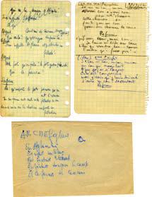 Ensemble de 3 pièces autographes sur pages de carnets. — 27/7/1957. Projet de chanson. « Je suis un con... un con... un con... Con d’avoir composé cett’chanson Cette chanson... faite par un con pourour charmer les cons », etc. — Dialogue. Sans date. « Les pots qu’on fêle. » — Poème. Sans date. « Afghanistan ».