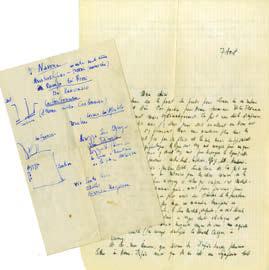 Lettre autographe signée, adressée à Michelle Vian. 7 août 1972 : 1 page 1/2 in-4°, enveloppe jointe. « Mon chéri, on est donc sur le point de partir pour Sienne où on restera trois jours et d’où l’on partir pour Rome : terminus. Voilà Florence revisitée — mollement mais systématiquement. Ça fait une drôle d’impression. Depuis environ dix ans, j’y étais passé, soit en allant vers Rome soit vers Paris. Et on s’y promenait. Mais nous n’entrions plus dans les édifices […]. Cette fois ci, on est entré partout : cathédrale, Uffizi, Pitti, Académie, Bargello, Chapelle Médicis, jardins Boboli, Santa Croce, etc. Ça fait drôle d’effet parce qu’on ne retrouve pas les choses comme on les avait vu. Par exemple, pour ce voyage-ci, celui qui s’impose, c’est Michel-Ange et les offices — que je n’aimais guère — m’ont paru précieux pour recaser les connaissances que l’on peut avoir sur l’histoire de la peinture. A part ça on a dîné deux fois dans un monastère transformé en hôtel, juste en dessous de Fiesole, le San Michele, superbe, on voit dévaler sur la plaine un petit bois troué de vagues clartés électriques et 2 fois à la Buca Lapi, chambre bruyante comme tu sais mais agréable. J’ai bien travaillé (j’ai essayé d’adapter la Nouvelle Critique à Mme Bovary. Et toi, mon Amour, que deviens-tu ? J’espère trouver plusieurs lettres à Rome. » On joint un plan autographe de sa visite de Florence avec dessins (plans).
