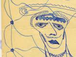 [Ville-d’Avray, 1920 - Paris, 1959], poète, romancier, parolier, auteur de théatre, trompettiste de jazz français. Dessin autographe à l’encre bleue et verte, intitulé « Charl’7 ». 1 page in-8°. La première idée de Boris Vian était de se représenter lui-même. Puis, il a ajouté un costume François Ier, un chapeau moyenâgeux, un maquillage à la fois masculin et féminin : moustache, lèvres et yeux fardés. Au dos, figurent des essais de signatures, comme sur beaucoup de brouillons. Au premier abord, on pourrait croire des vagues. On joint une pièce signée par Michelle Vian, commentant ce dessin.