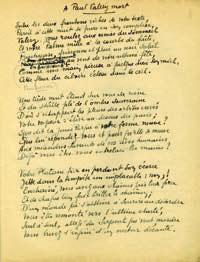 [Mèze, 1900 - Garches, 1988], photographe et poète français. Ami et admirateur de Paul Valery, il en fit plusieurs portraits. Manuscrit autographe signé, titré « Tombeau de Paul Valery ». Juillet 1945 ; 66 pages in folio. Recueil de poèmes à la mémoire de Paul Valery, décédé en juillet 1945 ; chaque poème est précédé d’un vers de Valéry qui l’inspire. Très précieux.