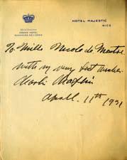 Album réunissant des autographes, des cartes ou lettres signées par : Charlie Chaplin, Arthur Rubinstein, Vera Sergine, Jean-Gabriel Domergue (dessin), Bonnat, Massenet (portée musicale), Gyp, Mistral, Saint-Saëns, Farrère, Maurice et Rosemonde Rostand, Lyautey, Grand duc Boris de Russie, Charles Münch, Prince Vladimir Romanov, Réjane, Anna de Noailles, Coquelin (portrait signé), Santos-Dumont (télégramme), etc.