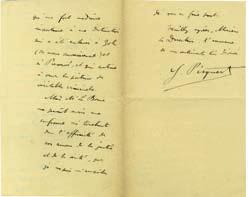 [Strasbourg, 1854 - Amiens, 1914], général et homme politique français. chef du deuxième bureau, il soutint l’innocence de Dreyfus, fut emprisonné et exclu ; réhabilité, il devint général et ministre de la Guerre. Lettre autographe signée, adressée à Henry Roujon. Paris, le 1er novembre 1900 ; 2 pages 1/2 in-8°. Il intervient en faveur compositeur de musique Fernand Le Borne, qui sollicite la croix de la Légion d’Honneur. « J’avoue que je ne me sens aucunement qualifié pour faire une semblable recommandation ; d’autre part, je n’attache qu’une fort médiocre importance à une distinction qui a été enlevée à Zola (du moins provisoirement) et à Pressenssé, et qui continue à orner la poitrine de véritables criminels. Mais Mr Le Borne me paraît avoir une confiance si touchante dans l’efficacité de son amour de la justice et de la vérité, que je ne puis m’empêcher de vous en faire part ».