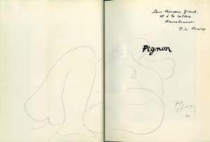 [Bully, 1905 - Paris, 1993], peintre, lithographe et céramiste français. Pignon par Jean Louis Ferrier. Presses de la connaissance, Paris, 1976 ; in-4° (30 x 23 cm), 223 pages cartonnage toilé noir de 223 pages, titre rouge sur dos et premier plat, jaquette rempliée illustrée en couleurs. Richement illustré de photographies et reproductions d’œuvres, noir et blanc et couleurs. Avec une biographie mise au point par Hélène Parmelin. Bon état. Grand dessin autographe signé au crayon d’E. Pignon, couvrant les deux pages, daté 1977. Envoi autographe signé de l’auteur à Françoise Giroud.
