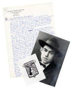 où il revient sur la personnalité de Charles Bonabel, leur relation et l’amitié qui le liait à CELINE. Constituée de 4 pages in-8 et datée du 8 juillet 1980, elle est constituée de deux parties, Qui était Charles Bonabel ? et L’amitié Céline-Bonabel. Rappelant le rôle pri- mordial de Charles Bonabel et da maison d’édition de musique, Disque-Office pour le Jazz en France (Claude LUTER…) il décrit dans le détail leurs relations autours des disques et du jazz, mais aussi de la littéra- ture ( Dickens, Bloy) et des écrivains contemporains qu’il aimait ou détestait ( Breton). Puis il aborde dans la seconde partie les relations de Bonabel avec Céline en concluant sa lettre par « Dans cette situa- tion de réprouvés, Charles et Eliane Bonabel ont gar- dés le contact avec Céline et Lucette Destouches… Ils n’attendaient pas de remerciements ultérieurs de l’intelligentsia, ils n’en ont pas eu. Tout est bien ! ». Ensemble complété par une photo argentique de Charles Bonabel dans les années 30 (noir et blanc 20x13 cm) et d’un exemplaire de son ex-libris
