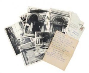réalisé en 1966 par Charles Bonabel (sur une idée de Pierre Cheymol et avec l’accord de Lucette Destouches comme l’indique une lettre de Bonabel jointe au dossier) des lieux de vie à Paris et en proche banlieue de Céline. La liste jointe manuscrite établie par Bonabel reprend 14 photos argentiques noir dont deux signalées comme détruites. En réalité l’ensemble ici présent est constitué de 29 photos noir et blanc (17x12 cm) avec au dos les lieux (Passage Choiseul, Rue Lepic, Rue Girardon, Editions Denoël, Dispensaire de Sartrouville, Saint-Germain-en-laye, Meudon, Clichy…). Précieux ensemble de photos de lieux ayant pour certains disparus