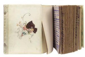 Manuscrit complet de son roman intitulé « Totote ». 845 pages in-4. Relié en deux volumes plein vélin crème, décors romantiques peints au dos et sur les plats. Joint le contrat passé entre la société des films Eclair et Gyp pour mise à l’écran d’un certain nombre de ses romans dont « Totote ». Contrat daté du 18 août 1913. Etui frotté et vélin poussiéreux -