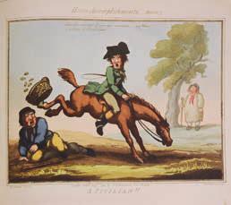 Horse accomplishments. London, R. Ackermann, 1799. In-folio oblong ; maroquin rouge, dos à nerfs orné, filets encadrant les plats, coupes filetées, dentelle intérieure, tranches dorées (reliure de la fin du XIX° siècle de Rivière & Son).Rare suite de 12 planches gravées par Thomas Rowlandson d’après les caricatures dessinées par Wood- ward et aquarellées à l’époque. Ex-libris d’Alfred Barmore Maclay. Coiffes et coins frottés, mors faibles.