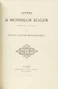 Lettre à Monsieur EGGER (sur divers passages de l’Au- lularia). Imprimerie Louis Perrin Lyon 1875. E.O. Tirage sur beau papier. Envoi signé de Benoist au libraire DURVAND. Reliure d’époque in-8 demi veau glacé, pièce de titre sur cuir bordeaux, dos avec accroc -