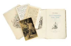Les confidences d’une aïeule. Paul Ollendorff Paris 1900. E.O. L’un des 50 ex de tête sur Japon ancien. Bien com- plet de la suite des illustrations de Louis MORIN sur Japon et ainsi qu’une suite hors texte coloriée. Exemplaire complé- té de 13 courriers manuscrits de Louis MORIN. En feuilles in-8 sous chemise étui frottée -