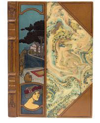 Bérénice de Judée. Romagnol Editeur Paris 1906. Première édition illustrée par de JONCIERES. L’un des 130 ex sur arches. Bien complet de la suite des illus- trations en trois états. Originale reliure in-8 demi maro- quin marron caramel à coins, dos à 4 nerfs et liserés à froid, plat avec un décor mosaïqué représentant un paysage avec le portrait de femme au premier plan. Tête dorée, couvertures conservées (reliure signée Bernasconi)