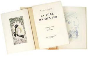 La fille aux yeux d’or. Editions la Tradition Paris 1946. Première édition illustrée par Maurice LEROY. L’un des 19 ex sur Arches, bien complet de la suite des dessins ainsi que d’un croquis original au stylo signé par LEROY. En feuilles in-8 sous chemise étui frottée -