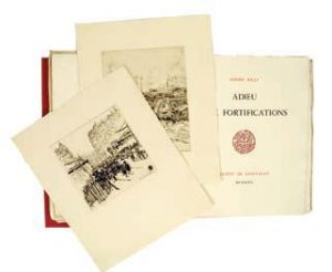 Adieu aux fortifications. Société bibliophilique de Saint-Eloi Paris 1930. L’un des 127 ex sur Arches. Bien complet de la suite des illustrations des artistes ayant participé à ce livre (CHAINNE, JOUAS, BOUROUX, GOBO…). En feuilles in-8 sous deux chemises étui, l’une pour le texte, l’autre pour les illustrations -