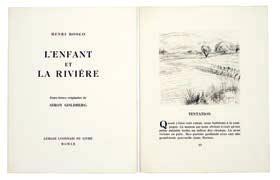 L’enfant et la rivière. Cercle lyonnais du livre Paris 1960. Première édition illustrée par Simon GOLDBERG. L’un des 185 ex sur Arches, seul tirage. Exceptionnel exemplaire complé- té de 5 dessins originaux signés de Simon Goldberg, de l’une des trente suite des illustrations tirée sur papier d’Auvergne et du menu de cercle en deux exemplaires avec la gravure de Goldberg illustrant ce menu en trois exemplaires. En feuilles in-4 sous che- mise et étui. Très bel ensemble pour ce superbe texte parfaitement illustré par ce grand sculpteur, et donc grand dessinateur, que fut Simon Goldberg -