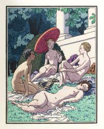 La leçon d’amour dans un parc. Editions Lapina Paris 1925. Première édition illustrée par Brissaud. L’un des 20 ex sur Hollande. Bien complet de deux suites des 45 aquarelles de Pierre BRISSAUD en noir et blanc sur Japon. Belle reliure grande in-8 demi maroquin bleu nuit à coins, dos à 5 nerfs richement orné, tête dorée, couvertures conservées (reliure signée Devauchelle) -