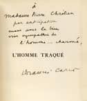 L’homme traqué. Librairie des Champs-Elysées Paris 1929. Première édition illustre par CHAS-LABORDE. L’un des ex sur Rives non justifié. Bel envoi à Pierre CHRETIEN. Reliure in-8 à la bradel, demi vélin crème dos lisse, couvertures conservées (reliure signée Merteens) -