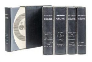 Œuvres. Editions Balland Paris 1969. L’un des 800 ex de tête sur pur chiffon. Illustrations de Claude BOGRATCHEW. 5 volumes grands in-8 demi maroquin noir, plats en plexiglas ornés, étuis (reliure de l’édi- teur réalisée par Mercher). Petit accroc à un étui. L’ensemble de l’œuvre de Céline, en version inté- grale, à l’exception des pamphlets -