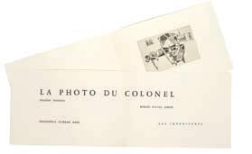 La photo du colonel. Editions des impénitents Paris 1964. Première édition illustrée par Yves JOBERT et frontispice d’Abraham KROL. L’un des 25 ex de tête sur Arches signé par l’artiste. Bien complet de la suite des illustrations sur marais ainsi que d’une estampe signée. En feuilles in-8 à l’italienne sous chemise et emboîtage -