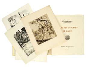 Marchés et foires de Paris. Société Bibliophilique de Saint-Eloi Paris 1953. L’un des 135 ex sur Arches. Exemplaire complété des suites des différents illus- trateurs de ce livre (TREMOIS, HALLO, BOUROUX, DECARIS, JOSSO). En feuilles in-8 sous deux chemises étui, l’une pour le texte, l’autre pour les illustrations -
