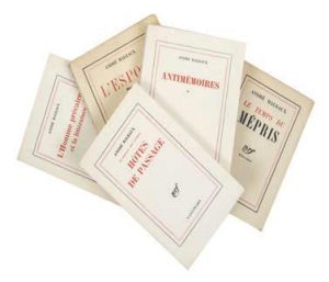 Ensemble de 5 E.O sur grand papier, tous brochés. Antimémoires (Gallimard 1967. E.O. L’un des 310 ex sur pur fil, 2ème papier)/ L’espoir (Gallimard 1937. E.O. L’un des 200 ex sur alfa)/ Le temps du mépris (Gallimard 1935. E.O l’un des 250 ex sur alfa)/ L’homme précaire et la littérature (Gallimard 1977. E.O. L’un 455 ex sur pur fil, 2ème papier)/ Hôtes de passage (Gallimard 1975. E.O. L’un des 365 ex sur pur fil, 2ème papier). Soit au total 5 volumes -